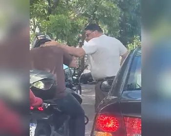 As imagens mostram o suspeito — vestindo camisa branca, calça e óculos escuros — discutindo com o motociclista, que permanece de capacete e não reage às agressões. Durante o confronto, o homem profere xingamentos e ameaças, chegando a dizer: “Você não me conhece… vá embora para que eu não lhe mate aqui”.