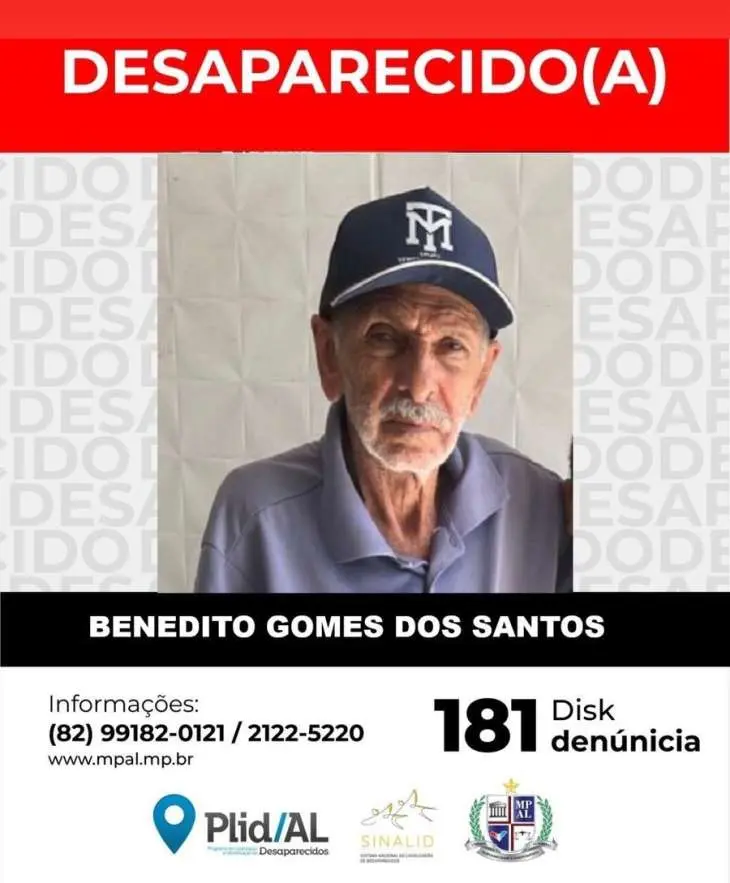 As autoridades e a família solicitam que qualquer informação sobre o paradeiro de “Bené do Leite” seja repassada imediatamente pelo disque denúncia 181, com garantia de sigilo ou ainda em contato com a Coordenação de Desaparecidos (PC/AL): (82) 98878-8897 ou diretamente com a família pelos números: (82) 98236-7074 / 99915-2023 / 99977-4135 / 98879-7276.