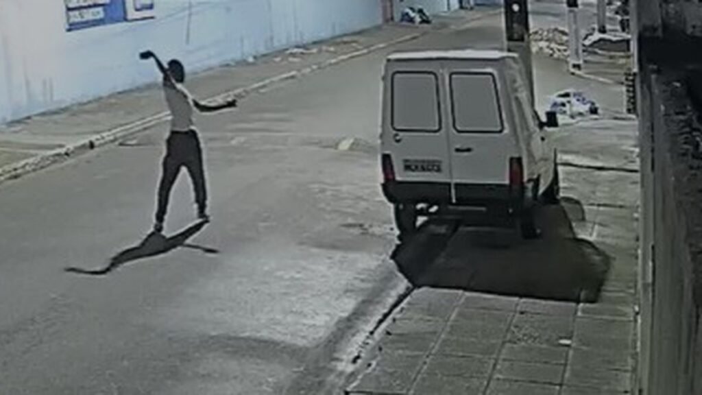 Em uma das imagens, o homem, que inicialmente aparece andando em uma rua, se agacha, pega duas pedras e as arremessa contra um veículo branco parado. Em seguida, ele deixa o local.